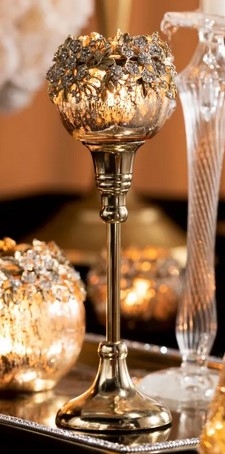 Windlicht groß Strass auf Stiel Met/Alu/Gl SILBER – B9cm*T9cm*H23cm